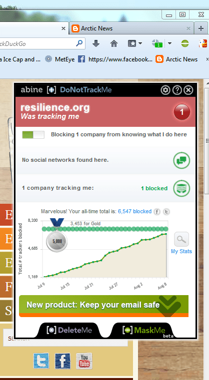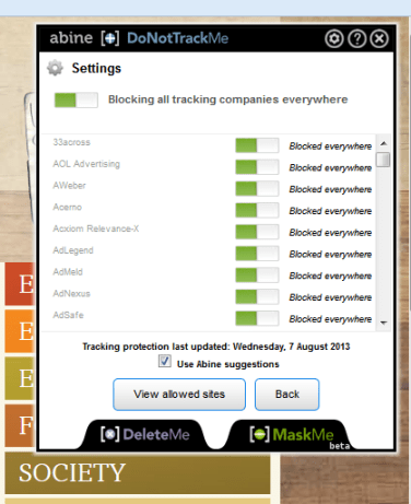 Here is something quite interesting. Since early July, I have been using the free blocking software from Abine.com called ‘DoNotTrackMe’ and more recently, ‘MaskMe’ to enhance and protect my internet browsing and email experience.