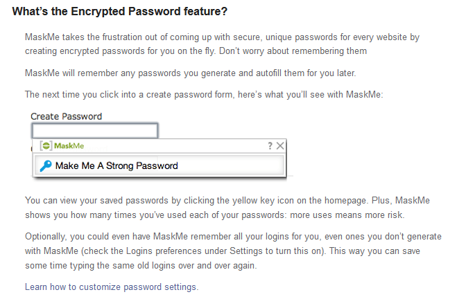 You will also see that whenever a new password is called for, MaskMe will offer to provide a unique encrypted password just for that particular website. From the Encrypted Passwords option on the Home screen you are provided with a convenient online list of all your masked passwords that you can cut and paste into sign-on pages as required or allow MaskMe to pre-fill the data. This means there is no necessity to use browser based saved password lists. See below.