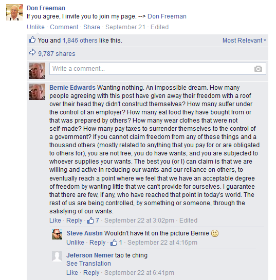 A guy called Don Freeman who appears to want people to join him in being, I’m not sure what, posted a picture with the message “YOU CAN’T CONTROL A PERSON WHO WANTS NOTHING”, and asked for people who agree, to join his page.