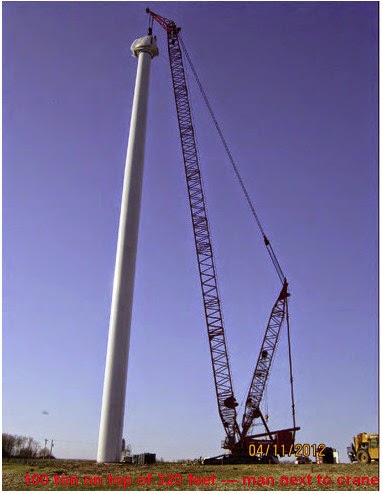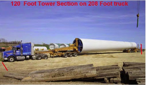 Next comes the tower, fabricated elsewhere, using, you guessed it, energy from fossil fuels. Oh, and that big semi-trailer thingy runs on diesel :
