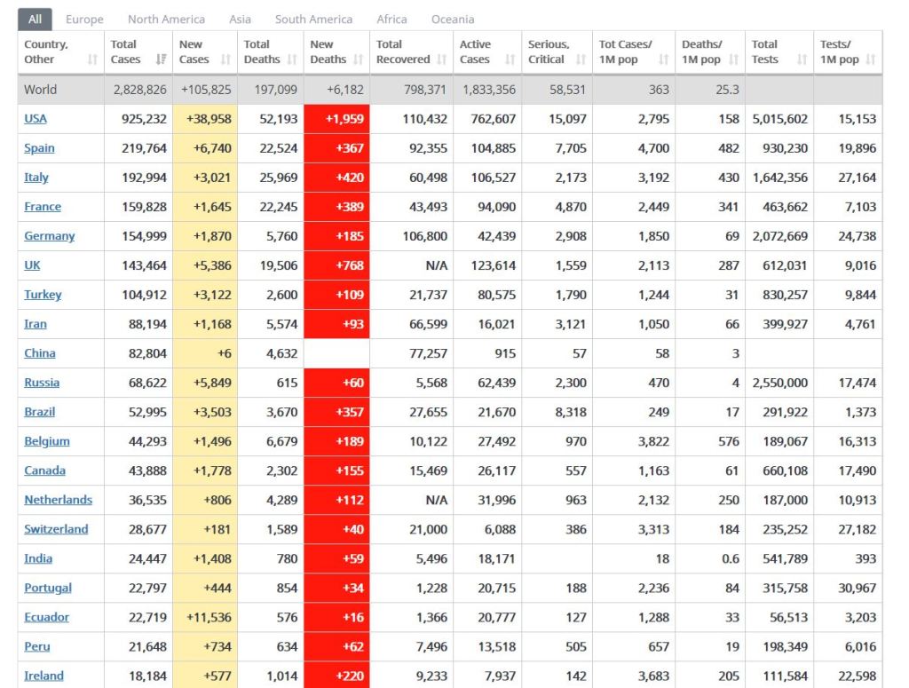 The US is still the leading nation with just under 39,000 new cases, but in many others the numbers are growing fast. These include, listed in decreasing totals order, Ecuador, Spain, Russia, UK, Brazil, Turkey and Italy, all recording multiple thousands of new cases as at yesterday.