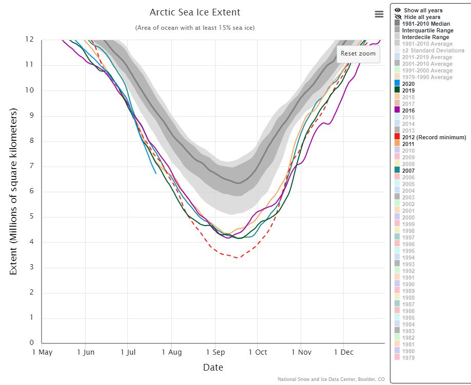 This year, and I have taken a zoomed snapshot of the interactive graph provided daily by NSIDC -It shows that 2020 – the loose blue thread dangling ominously from the patchwork of the five lowest years on record (2012 being the dashed red line).It shows that on July 21 this year (a couple of days ago) there were a little over a half million square kilometres less ice cover than at any time on record for that same day (and that previous low was set only last year – the green line).