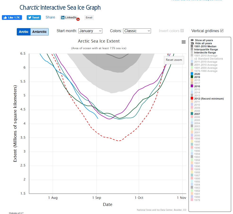 So. The point of all this, if I haven’t already lost you, is to make the point – just revealed today – that the brand new decade, the ‘twenties’, is starting off with its own standout year (being the only one for now) which is clearly setting the pace for the continuing decline of Arctic sea ice. As of today, 2020 (see the blue line in the image) is clearly to be the second lowest year of remaining sea ice in the Arctic. I have been waiting for 8 years to be able to say that.