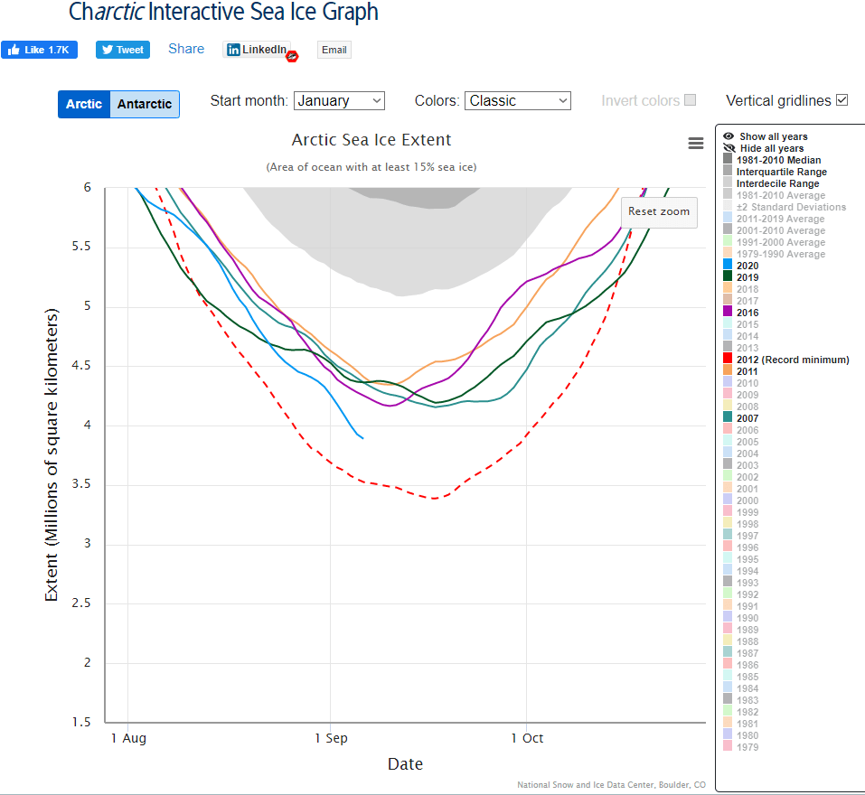 I said then that 2020 – the blue line – would not break the 2012 – the red dashed line – all-time record for sea ice melt, and it won’t, but look how it is challenging that record, pushing for all it is worth to get somewhere close to it.