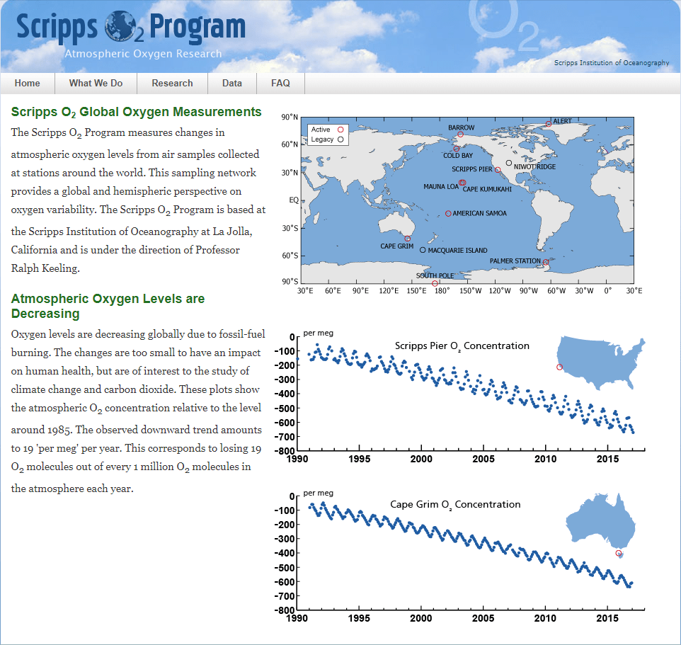 It is also a not too widely known fact that atmospheric oxygen content has been falling in measurements taken since 1985. See the two images below for more. While this is not at the moment critical, it is a trend, and 1) the CO2 levels in the atmosphere are still rising, while 2) we have not yet suffered a massive CO2/Methane surge that scientists have been warning about as a result of rapid permafrost melt. Just thoughts to ponder while we are still able to breathe without much concern.