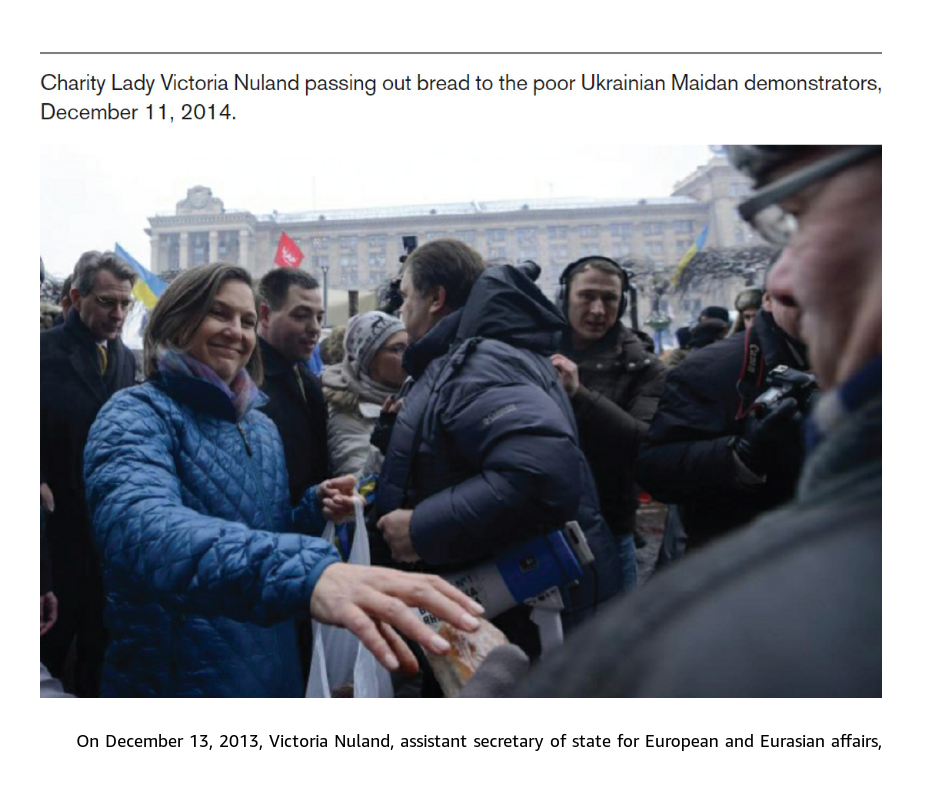 The image below is of Victoria Nuland in 2014, the woman who is now Deputy Secretary of state of the United States in the Biden regime (can’t call it an administration – it isn’t legitimate). She is seen handing out bread to Ukrainian citizens, the poor unfortunates who were largely forced into that position following the bloody US, CIA instigated, Barack Obama regime?/administration ordered and controlled, 2014 coup which ousted a democratically elected, but Russian leaning, Ukraine President and replaced him and the entire Ukraine government with hand picked Nazi party members, most of whom were sworn (what Americans whimsically call) anti-semites – although more importantly for the US (seemingly blind to those other vices) – anti-Russians.