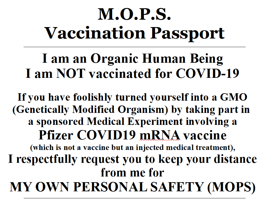 In anticipation of that, I have produced the attached Vaccination Passport for those who have cognitively determined not to become a GMO themselves by refusing to be vaccinated.