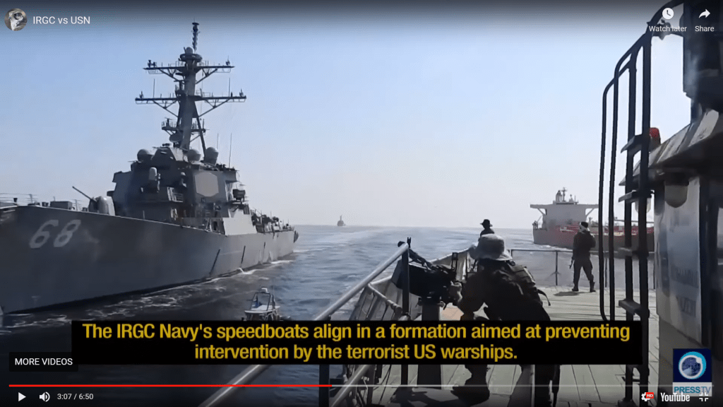 Well, I don’t think we – and particularly the US Navy – will easily forget November 5, 2021. For today is the day when the US, hoping to make off with yet another tanker load of stolen oil (stolen from where, is not stated, but I suspect from the Syrian oilfields north of the Euphrates, where the Americans have been continually stealing Syria’s oil for at least the past 4 years and trucking it out through Iraq – obviously to awaiting tankers at some convenient oil terminal in gulf waters), [note: I am still trying to finish a sentence here] when the fugitive oil tanker – accompanied by two USN Arleigh Burke class destroyers – was boarded by IRGC commandos and surrounded by Iranian fast attack patrol boats and a catamaran. The Iranians took control of the tanker, with the intention of preventing the theft, denying the US of its stolen oil cargo, and effectively corralled the US destroyers to prevent their intervention.