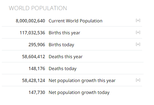 Well, there’s something I wasn’t expecting to see today. Most recently I have been projecting the 8 billion figure to arrive in the second half of December – based on the Worldometers clocks. And it even began to look like event this might slip into the first week of January 2023. But there has been a recent UN reset of the totals by nation and the UN has already announced we are 8 billion strong. I first found the announcement on TASS – ‘World population reaches 8 billion, says UN’. Following that up with the UN, it appears that the adjustment necessary to reset the numbers was recently made, and reported here…