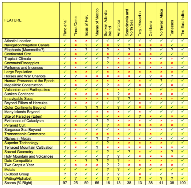 I will close this part of the discussion with the statement that it is of no use whatsoever looking for Atlantis in what we know as the Atlantic ocean, which simply does not fit any of the criteria relayed by Plato and, perhaps more importantly, was not so named at the time of the events being discussed. The Atlantic Ocean, in the first millennia B.C.E. referred to the waters where the continent of Atlantis was located and which encompassed all the oceanic waters of the world (civilised mankind having knowledge of all of them), including what we know as the Indian and Pacific Oceans, the South China Sea and the Great Southern Ocean. Those facts enabled the author of the table below to tick the ‘Atlantic Location’ box for The East Indies location. I give you the 100% fit case, as shown in the table below, which comes from the book – Atlantis City in The Java Sea. The Location – the island being there no longer, is to be found in the area to the east of the Sunda Strait and in the Java Sea, in the region the table below refers to as ‘The East Indies’, and was situated near the same now disappeared land bridge that brought the Melanesians and Australia’s First Peoples to their current homelands. Simple, isn’t it. When you get it right. That’s an assertion. It may also be a truism to the best of my knowledge.