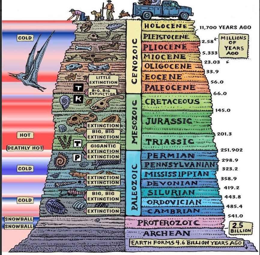 The first thought to broach is that this image has a vertical scale which begins as ‘years’, quickly changes to ‘millions of years’ and finally to ‘billions of years’. So it is in no way linear and ridiculously over-emphasises the length of our current age, the Holocene, which would be more accurately depicted as the thickness of one of the black lines which separate the listed geological ages on the right.