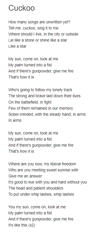 In the second video – a must watch – we have, in an excerpt from a Russian version of ‘The Voice’ talent show from 2016, a stunning performance of Kukushka. It is sung by a young girl. Only 7 years of age at the time, this was the obviously talented Yaroslava Degtyareva. I was won over by this young lass from the first note. She completely nailed it – and it is a serious song, apparently enjoyed widely by Russian troops. I think you will see why that is, from the lyrics I list below.