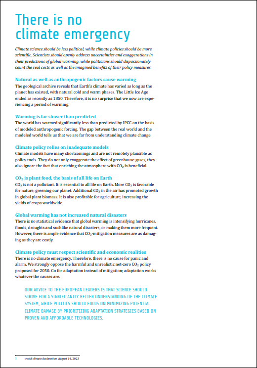 Then, read the World Climate Declaration signed by 1609 real scientists in August 2023. The important parts are contained in the two images below. The rest is just a page list of the signatories, mostly scientists, from many countries. I rest my case, well, after the next quotes.