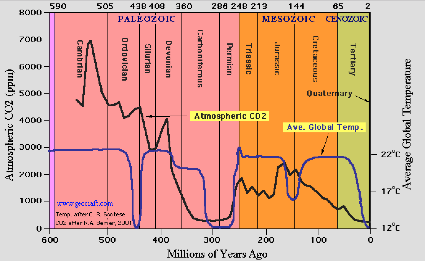 Allow me to point out, and this is of extreme importance, that such low levels of CO2 concentration in Earth’s atmosphere were disastrous to the planet, the normal levels over the past 250 million years having fluctuated between 1,000-2,000 ppm and much higher than that in earlier epochs beyond 350 million years ago. The chart to the right clearly shows that. Perhaps even more importantly, it also shows there is, and never has been, any correlation between CO2 levels and planetary temperature.