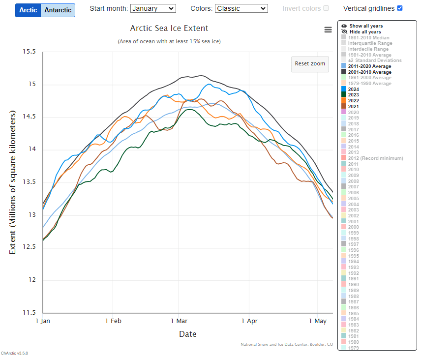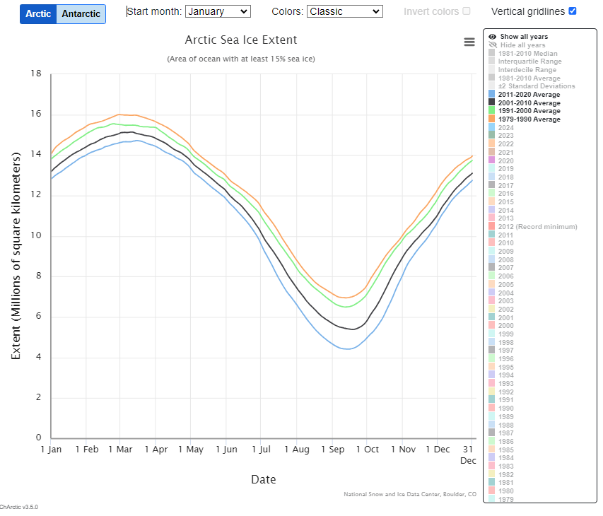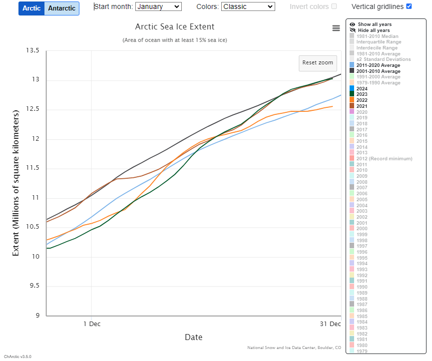 Anyway, the main ‘takeaway’ from this, as I see it, is that most of the ice formation activity takes place between the two decadal averages lines, except for 2023 which continued the lower than average ice formation begun in the last week of 2022. But 2024, on the back of the high ice formation finish (close to the average of two decades earlier) of the 2023 effort, continued as an exceptionally high ice formation year. Whereas 2022, taking off from a similarly high finish of 2021, suffered an exceptionally early peak in the last week of February – the annual peak of ice formation normally taking place during March.