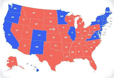 This is a re-issuance of the post I made late last night, which was – I thought – a rather clever play on colour. It may have been a little too clever for some, leading to possible misinterpretation of my meaning. Rather than turning ‘red’ in the ideological sense, the country is, if anything, now leaning more to the right than in even distant times. Yet is is definitely more ‘red’ than ever, as a glance at the map will confirm. Will Donald Trump become a new Hitler figure? A Jeanne D’arc (hardly)? Or a Nero perhaps?