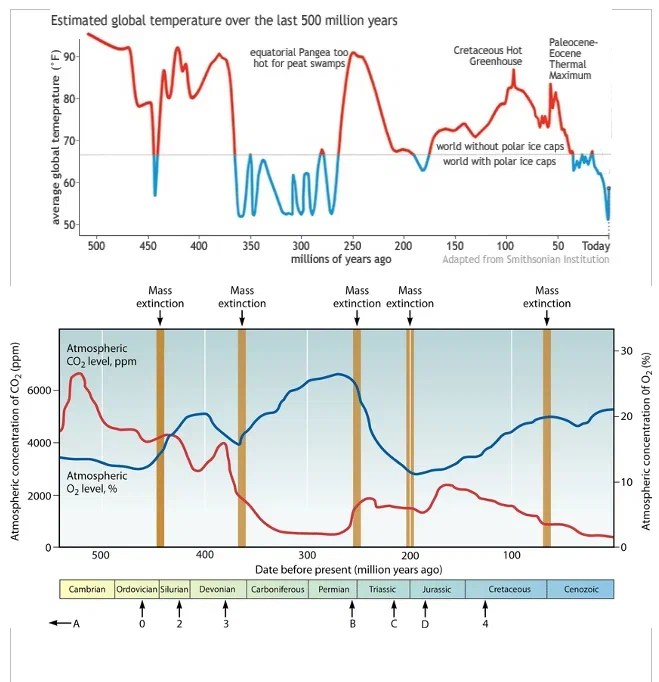 Realising that they both used a similar time-scale – which I could more or less homogenise by stretching one to match the other – and, by so doing, permit a level of time-comparison previously unavailable to me. Revealing an unprecedentedly (in my personal experience) clear image of the variance between temperature, Carbon Dioxide, and Oxygen, over time, across the most important half-billion years of Earth’s history. The results are quite enlightening.