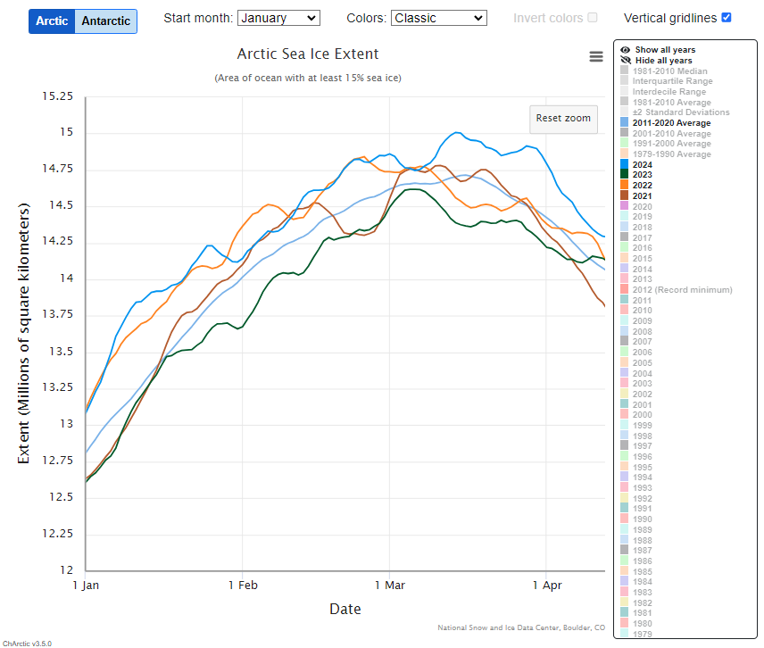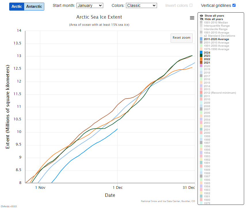 This year may end with 2024 remaining below the previous decade line, although stranger things have happened. But with two of the earlier years of the current decade well above that line and the third only a little below it, the year may end with a four year average in positive territory. A good start to the completion of the Winter ice-build season in the first quarter of next year. To the chart at right, showing that first quarter of the year, from ‘1 Jan’ will be added a new line with a different colour and starting at the end point of wherever 2024 happens to finish the year. That new line will be of great interest and importance as the year progresses, because it will mark the half-way point of the current decade at the date it is added, allowing us to gauge whether there is more or less ice on that date in the current decade than there was in the previous decade. That is an exciting prospect, and indicative as to whether the things I have been talking about are likely to be increasingly meaningful as the picture for 2025 continually builds. Each day or month could be another nail in the coffin for climate alarmism. The new year’s chart will initially look exactly like this year’s chart (for the months and years selected), since they have already been built – and recorded for posterity. Only the new line will gradually snake its way through, plotting its own course, as it happens.