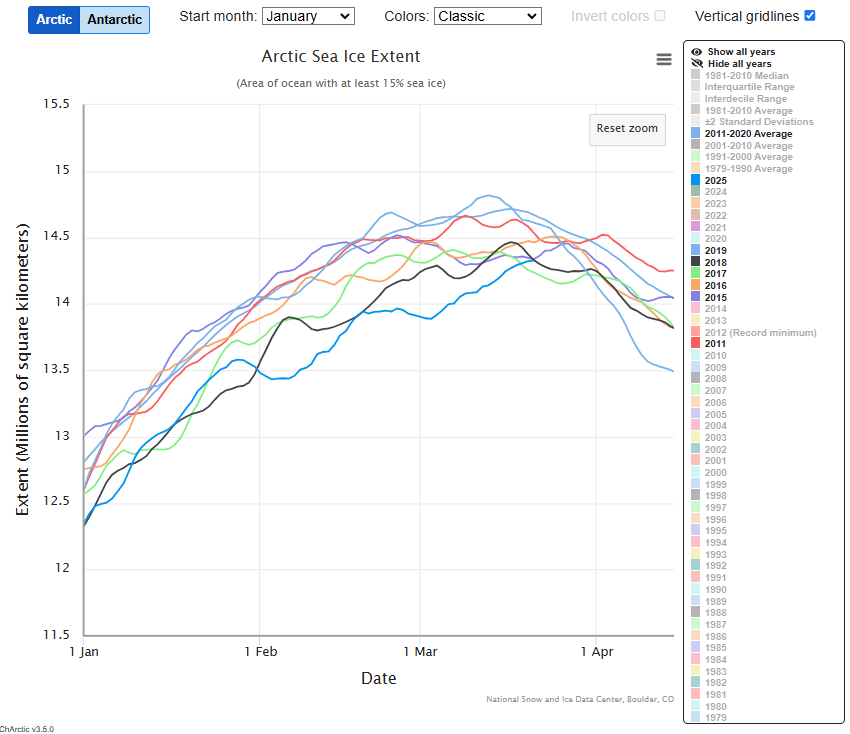I have to admit that while not overly concerned (because I knew it would not make much difference in the long run), the slow build of Arctic sea ice this year did prove cause for me to check its status more frequently than other recent years. I need not have done that, because 2025 has turned out to be quite an exceptional year in raising its Winter ice. It is now the latest year to reach its peak ice growth than all others in the satellite period. And that may have some sort of additional damping effect on the coming melt season.