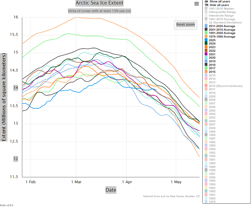 All five years, 2020 to 2016 (from previous decade) plus the next most recent year (2021), show less ice present from now to the end of April than the most recent four years (2022 to 2025). Check it.
