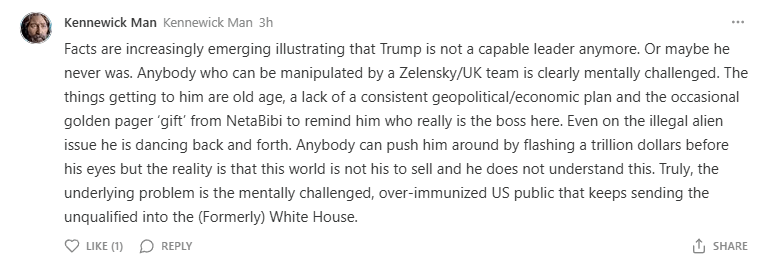 That’s really all I have to say, except that the inspiration for this post is a comment I read (I don’t often read comments, but this is a blinder – the reality being found in the quote: “…this world is not his to sell and he does not understand this”) in response to yet another Andrew Ryabko piece. I will include the comment here as a linked image, from which you can also view the related article ‘The Brits & Ukrainians Are Plotting To Manipulate Trump Into Escalating Against Russia’…