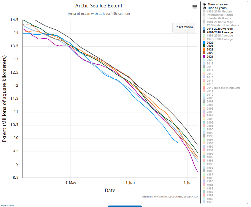 After a brief period of becoming the lead ice building year of the current decade (from 2021) towards the end of April, the bright blue line of 2025 gradually sank towards the previous 10-year average, the less bright blue line, and went below it again just before the end of May, remaining there throughout June. But in the last couple of days the line has turned slightly back toward that average line again.