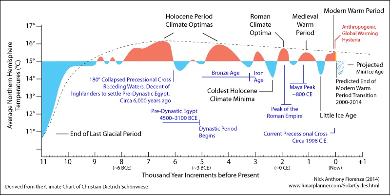 You will notice that the peak period of temperature during that depicted timeframe occured between 6-7 thousand years ago and there have been a number of decreasing peaks since then, the last of them – labelled ‘Modern Warming Period’, which is our own time (the last half millennia), due, according to the chart, to come to an end round about now. Quite humourously following a period of ‘Anthropogenic Global Warming Hysteria’. It should now be obvious to the reader why the term ‘Hysteria’ is used in that tag.