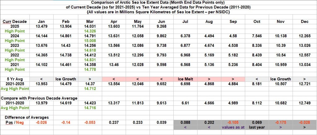 What this shows is that there is only a slim chance that this month, as an average value for the current decade, to be a positive outcome for Arctic Sea Ice Extent over the previous decade. But it will be more or less on par with the results for that decade. Which has great meaning, that the current decade will not see the million Km2 extra loss of sea ice per decade which has occured over the previous two decades. My prediction that this decade will be a turning point in the Northern Sea Ice story, in line with the expected arrival of the next glacial period in Earth’s history, quite soon – in geological terms.