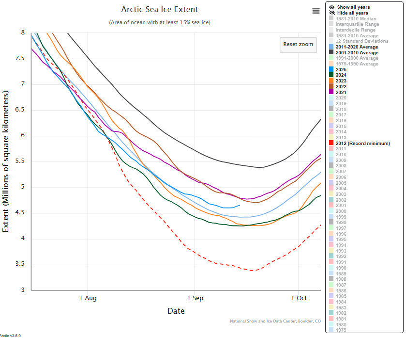The image shows something remarkable going on right now. It is not an answer to why the climate is changing e-v-e-rrr – s-ooo – g-r-a-d-u-a-ll-yyy, or what changes are being made in the current age (hint: it is not global warming). But it does show that in recent years (I chose to show 2021-2025) that the rapid growth of ice loss in the Arctic Ocean over the past two decades (the paler blue and black lines) has suffered a complete stoppage of the expansion in the current decade and that Northern Sea Ice and has, this year, begun to grow again (in mid-September no less) at least a week earlier than normal.