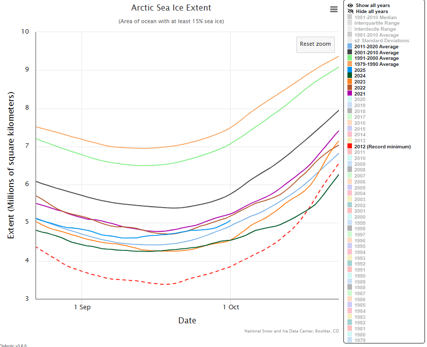 The data for the end of September is now in, and it shows a more promising situation than might have been expected, and reveals some useful trends. Here is the image produced on the NSIDC interactive climate charts for Arctic Sea Ice. This time I have included the decadal average ice extent lines for all four decades since satellite data became available, because I want to show something important that can only be seen from distant results.