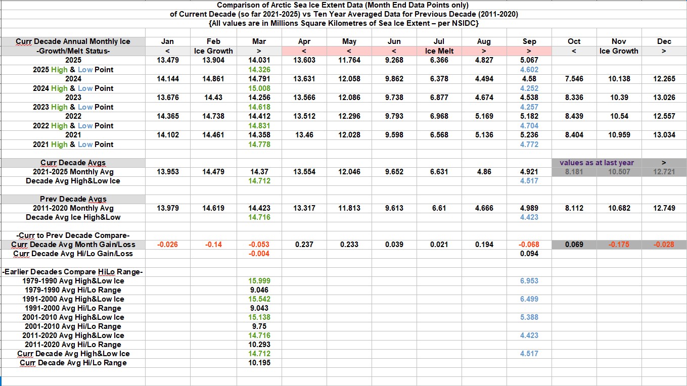 There has been an average increase in Arctic sea ice coverage, over the past +four decades, of at least 1 million and perhaps (if my suggested increases materialize) 2 million Km2, across each annual progression between high and low values. The values range from 9 million to 11 million, currently sitting at a little over 10 million Km2, half way through the decade, as can be seen in the bottom group of data in the spreadsheet. This is because while the ice building and ice remaining values are both going down (at different rates) and, additionally, that trend is in process of reversing, all of this means that throughout the satellite period of +four decades, the average range of ice coverage has actually been all the while increasing.