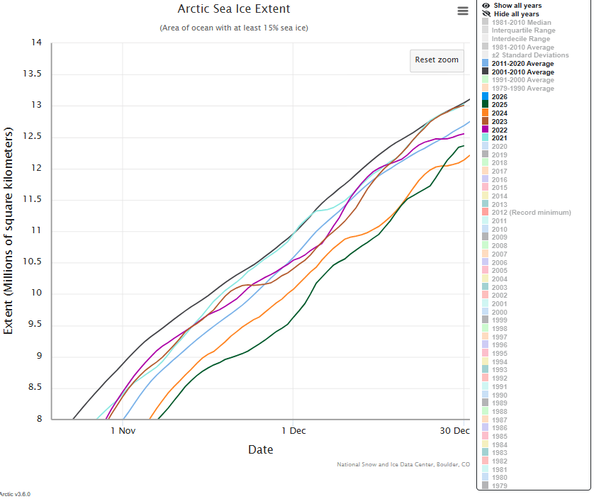 Here we can see that it was not until the final few days that 2025 showed any real promise of a better start for 2026 than was inherited by itself from 2024. But the most remarkable thing about 2025, visualising the data in the spreadsheet below, is that the year (after being given a poor start from 2024), intertwined itself about the previous decade average for the rest of the year. Half of which was spent above the average line and half below, in terms of the twelve monthly comparison points which is as far as I am willing to go to calculate this. The result confirming (to some extent) that previously expanding sea ice loss has now ceased entirely. If this continues for the second half of the decade (very possible , and expected, due to historic climate data over the past several hundred thousand years, backed by climate patterns over much longer periods than that), then we are provided with increasing hope that those both medium and long term patterns will continue to recur (with minor variations of course) for millions of years to come. What an exciting prospect, and one which would make our current century efforts at climate adjustment look rather foolish and our recent generations of humanity to appear as quite stupid and not in the least bit scientifically driven to the hind-sight gaze of our future descendants.