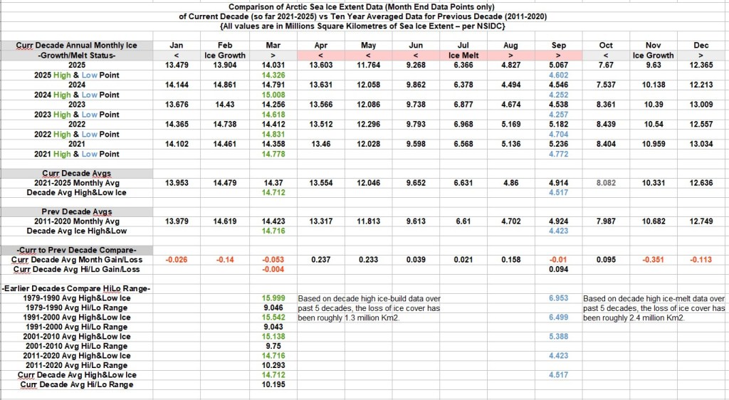 In the images below of the end of year situation on Arctic Sea Ice – we are now in the middle of the latest Winter sea ice growth period – and my monthly, end of year (mid point of current decade), spreadsheet of results, a new message is forthcoming, in real time, with every month and year that passes, to further reinforce the ideas I stated earlier.
