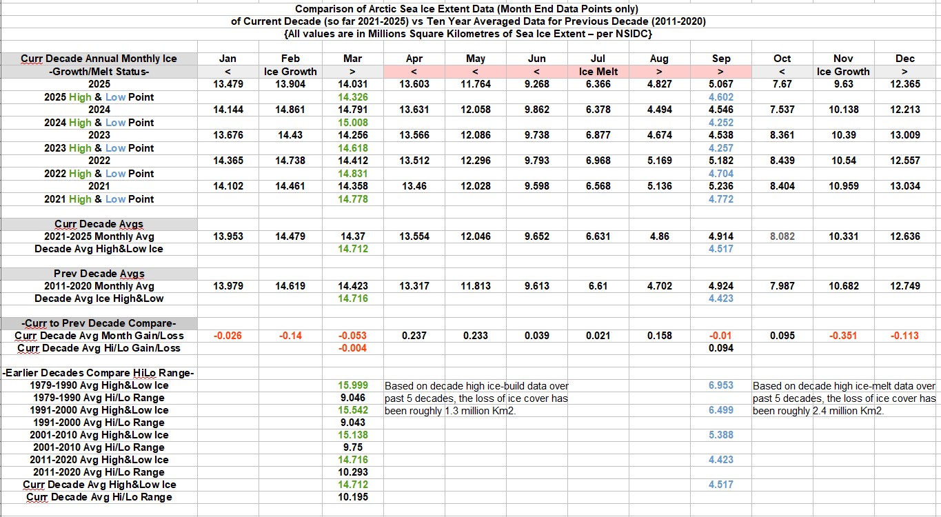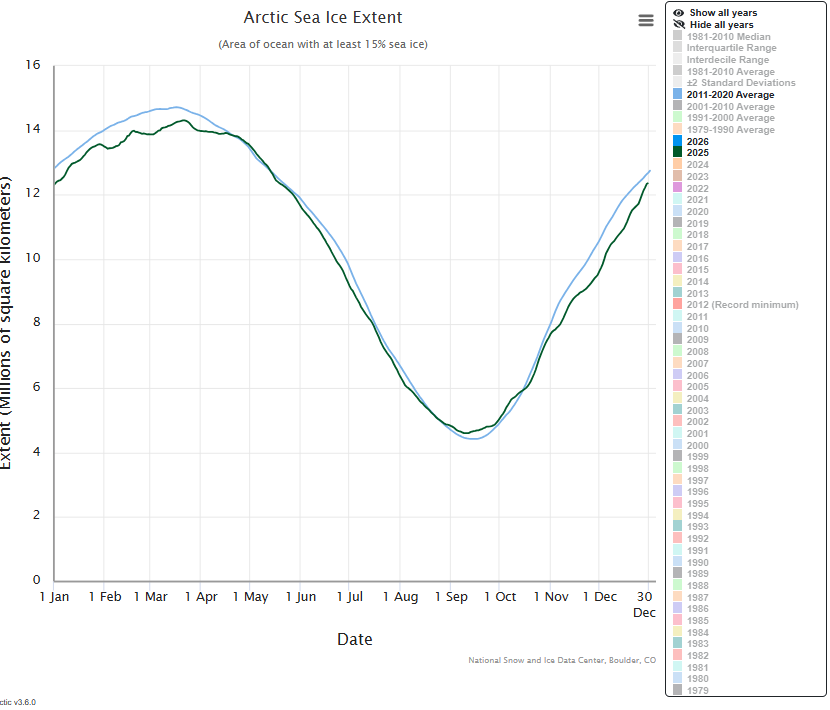 Here we can see that it was not until the final few days that 2025 showed any real promise of a better start for 2026 than was inherited by itself from 2024. But the most remarkable thing about 2025, visualising the data in the spreadsheet below, is that the year (after being given a poor start from 2024), intertwined itself about the previous decade average for the rest of the year. Half of which was spent above the average line and half below, in terms of the twelve monthly comparison points which is as far as I am willing to go to calculate this. The result confirming (to some extent) that previously expanding sea ice loss has now ceased entirely. If this continues for the second half of the decade (very possible , and expected, due to historic climate data over the past several hundred thousand years, backed by climate patterns over much longer periods than that), then we are provided with increasing hope that those both medium and long term patterns will continue to recur (with minor variations of course) for millions of years to come. What an exciting prospect, and one which would make our current century efforts at climate adjustment look rather foolish and our recent generations of humanity to appear as quite stupid and not in the least bit scientifically driven to the hind-sight gaze of our future descendants.