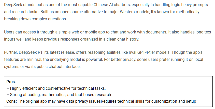 I admit to having had one conversation with a chatbot – the Chinese ‘DeepSeek’ AI engine – a natural choice if, as readers of my blog would guess by now, I am anti-pro-western thought. And even the answers I got from it maintained a distinctly pro-western bias without offering any other alternative world-view. Although it did maintain a very polite dialog, even after I rebuked it for biased thought. Here is a review of DeepSeek (image ) by secondtalent.com