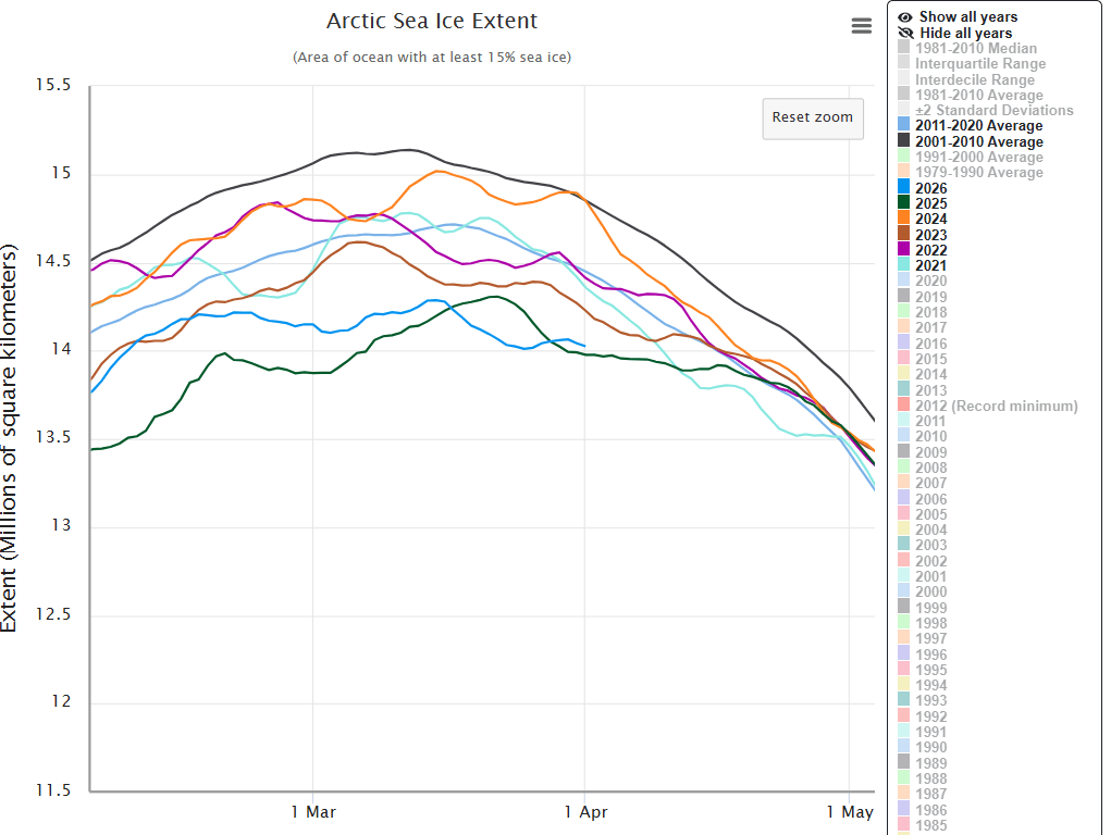 It is pretty clear now, that 2026 reached its peak sea ice formation around Mid-March and has narrowly failed to live up to even the poor showing of last year. A new low for this task – if the data can be trusted – and that is really all we have to go on for these details. I’m sure someone in the alarmist ranks will make a show of that as being some sort of proof of drastic climate change. Nothing of the sort of course can be inferred from this. The decade peak average (for the 6 years so far unrolled for the ’20’s decade) remains only marginally below that of the previous decade since for 4 of those 6 yrs the Winter peak was higher than that previous average. This can all be seen in the image below.