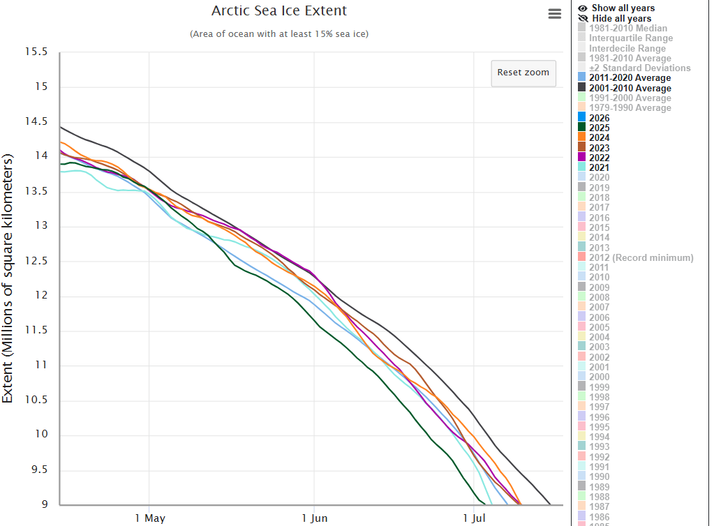 If 2026 acts in much the same way as 2025, then we are likely to see a continuation, perhaps even more marked, of the trend already established for this decade. Which will indicate a considerable lowering of sea ice melt at Summer peak – with 4 years considerably less than for the 2011-2020 decade – i.e. some way above that decades blue average line. That will make it very difficult for climate alarmists to argue for runaway Arctic sea ice melting. Don’t you agree?