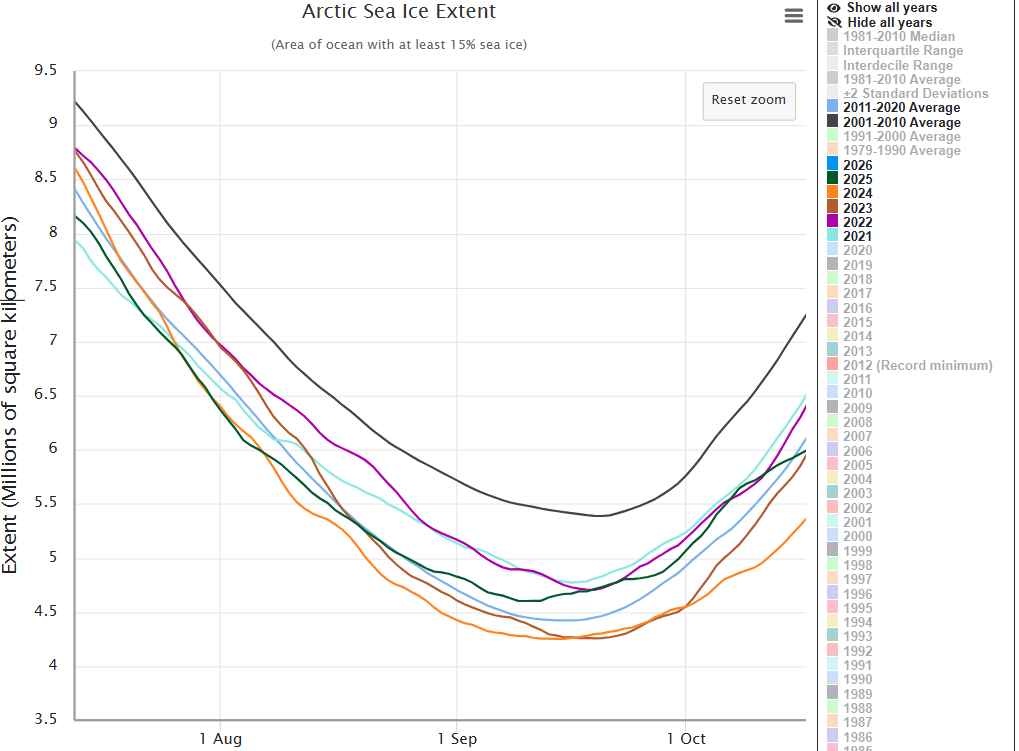 If 2026 acts in much the same way as 2025, then we are likely to see a continuation, perhaps even more marked, of the trend already established for this decade. Which will indicate a considerable lowering of sea ice melt at Summer peak – with 4 years considerably less than for the 2011-2020 decade – i.e. some way above that decades blue average line. That will make it very difficult for climate alarmists to argue for runaway Arctic sea ice melting. Don’t you agree?
